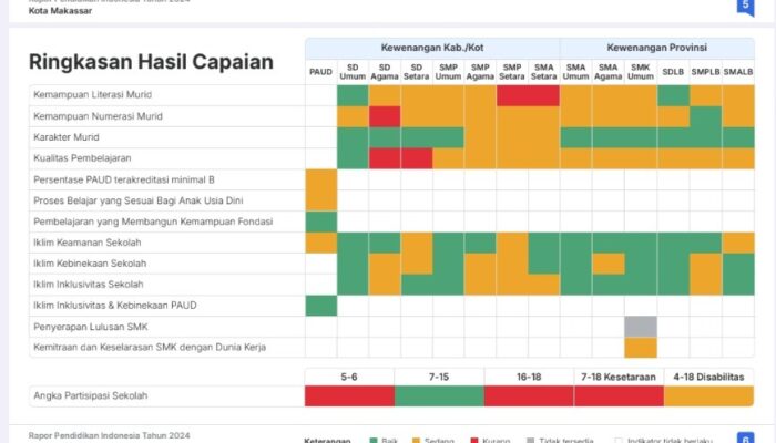 Di Kota Makassar, dari 148 SMP swasta dan 55 SMP negeri, sekitar 85 persen sekolah menunjukkan tingkat literasi yang sangat kurang. Ini terlihat jelas pada Rapor Pendidikan Tahun 2024, yang hasilnya berasal dari pelaksanaan Asesmen Nasional tahun sebelumnya. Hampir seluruh sekolah tercatat “merah” pada rapor literasi dan numerasi.