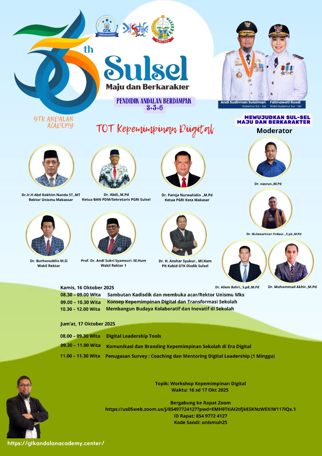 Dalam rangka mempercepat transformasi pendidikan dan memperkuat peran guru sebagai agen perubahan di era digital, Dinas Pendidikan Provinsi Sulawesi Selatan mengadakan kegiatan Training of Trainers (TOT) dengan tema “Membangun Ekosistem Kepemimpinan Digital di Lingkungan Sekolah”. (16/10/2025)