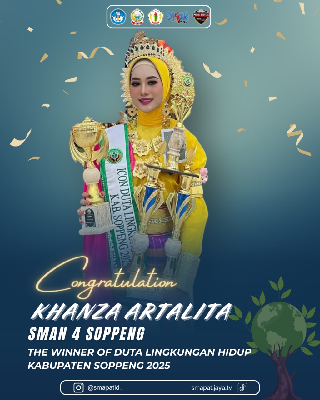 Satu lagi prestasi membanggakan datang dari dunia pendidikan Kabupaten Soppeng. Khanza Artalita, siswi kelas X.2 dari SMAN 4 Soppeng, berhasil meraih Juara 1 Pemilihan Duta Lingkungan Hidup (Green Ambassador) Kabupaten Soppeng Tahun 2025, yang diselenggarakan oleh Dinas Lingkungan Hidup Kabupaten Soppeng.