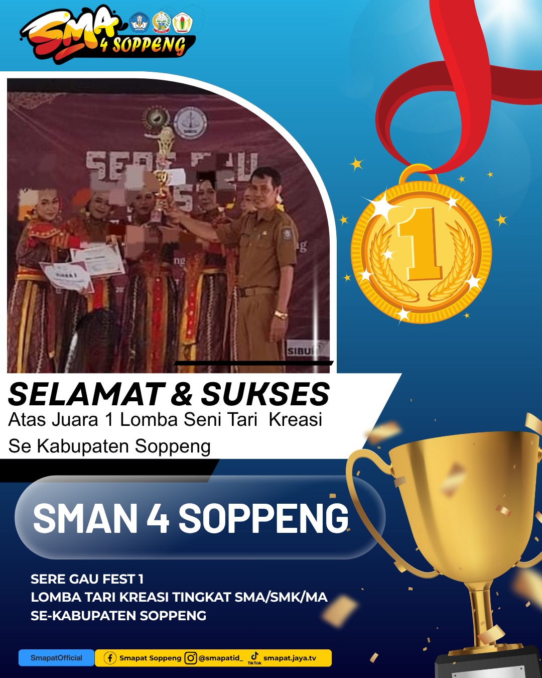 SMAN 4 Soppeng kembali menorehkan prestasi gemilang dengan meraih Juara 1 dalam Lomba Seni Tari Kreasi yang digelar oleh Mahasiswa UKM Seni Sekolah Tinggi Agama Islam (STAI) Al Gazali Soppeng pada acara “Sere Gau Fest” tingkat SMA/SMK/MA. (20/10/2025)
