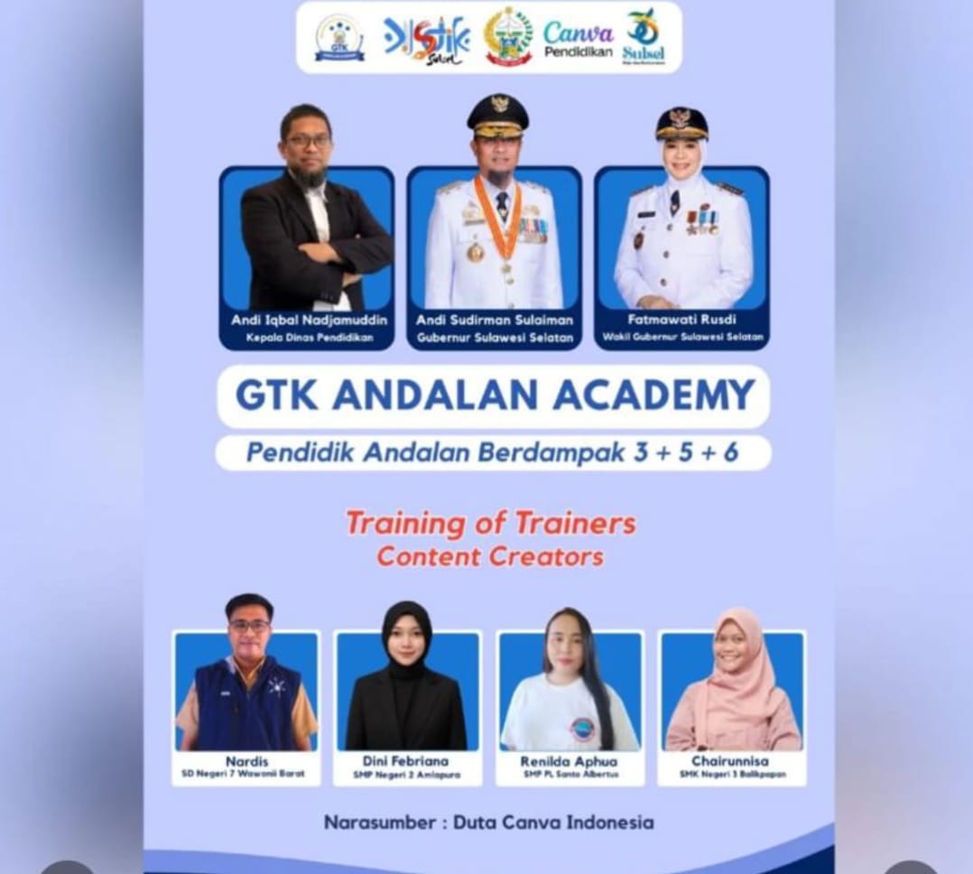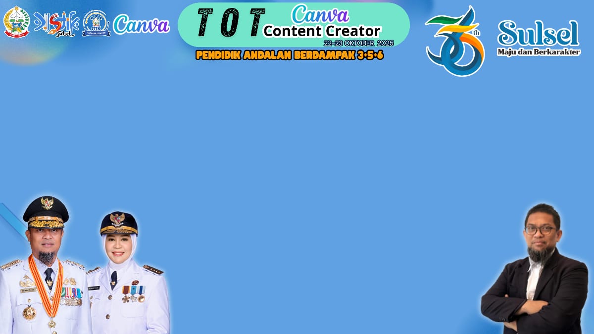 Dinas Pendidikan Provinsi Sulawesi Selatan kembali menunjukkan komitmennya dalam meningkatkan kualitas pendidik melalui pelaksanaan Training of Trainers (TOT) Pelatihan Canva yang menghadirkan para pemateri profesional dari Duta Canva Indonesia. Kegiatan ini merupakan bagian dari program strategis Pendidik ANDALAN Berdampak 3 + 5 + 6, yang menjadi motor penggerak transformasi pendidikan di Sulawesi Selatan.(22/10/2025)