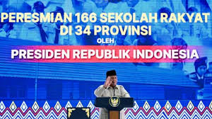 Presiden Prabowo Subianto secara resmi meresmikan 166 Sekolah Rakyat yang tersebar di 34 provinsi di seluruh Indonesia pada Senin (12/1). Peresmian pusat pendidikan ini dipusatkan di salah satu titik Sekolah Rakyat di Jakarta Timur dan diikuti secara virtual oleh para gubernur serta pegiat pendidikan dari Sabang hingga Merauke.
