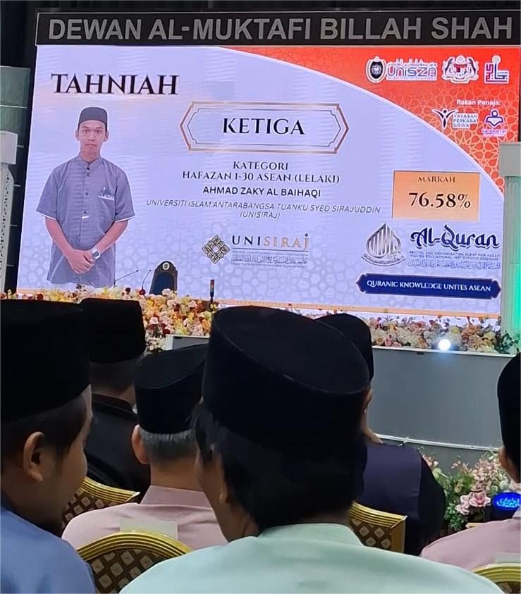 Pelajar Universiti Islam Antarabangsa Tuanku Syed Sirajuddin (UniSIRAJ), Ahmad Zaky AlBaihaqi, berjaya meraih tempat ketiga dalam Majlis Tilawah dan Hafazan Al-Quran Peringkat Institusi Pendidikan Tinggi (IPT) yang telah berlangsung di Universiti Sultan Zainal Abidin (UNISZA), Terengganu dari 12 hingga 15 Februari 2026.